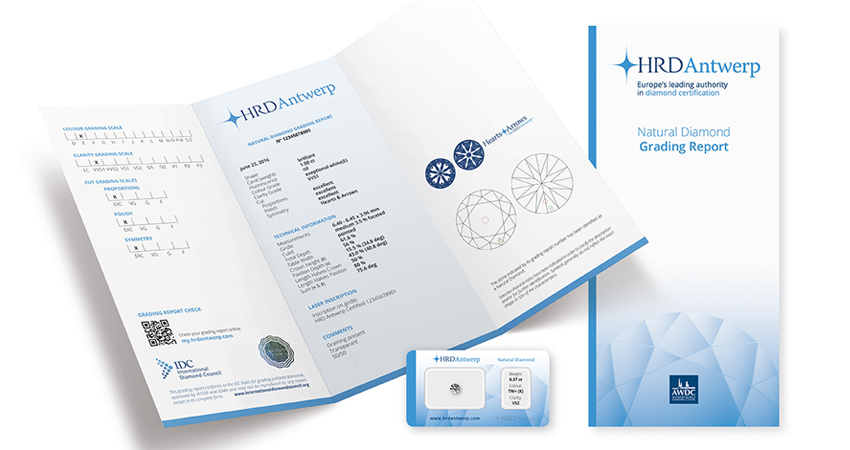 The HRD produce diamond grading reports on all diamond shapes including fancy coloured diamonds. HRD diamond grading reports include all millimeter measurements, table %, crown height % and pavilion depth %. HRD diamond grading reports also provide a Proportions and Finish grade.