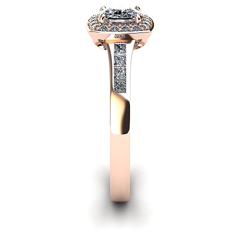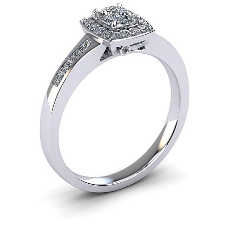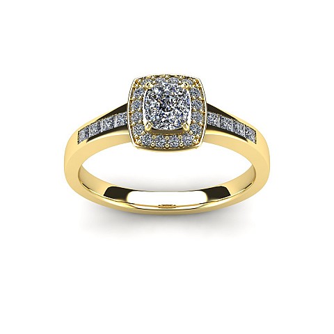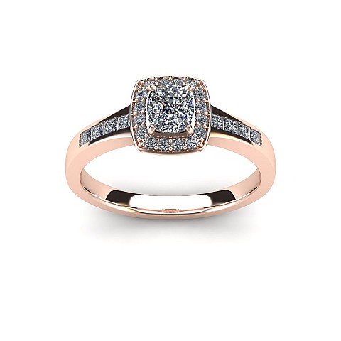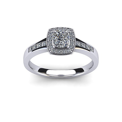 A gorgeous old world glamour style diamond engagement ring. The Cushion cut centre stone is surrounded by round brilliant cut diamonds and the shoulders are decorated with Princess cuts.