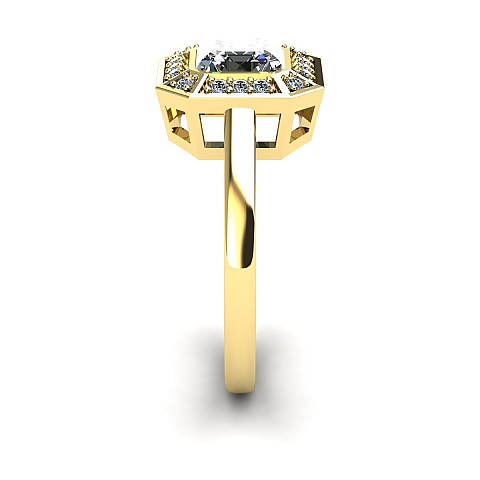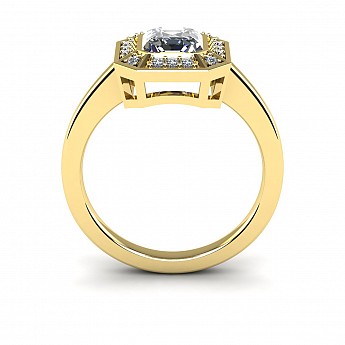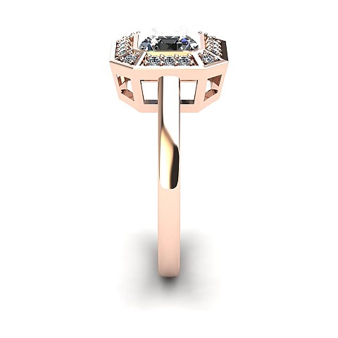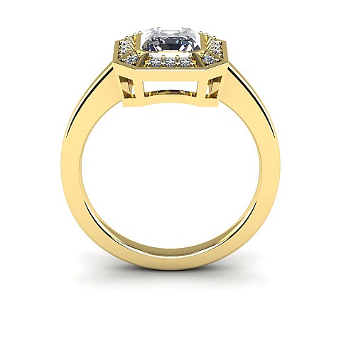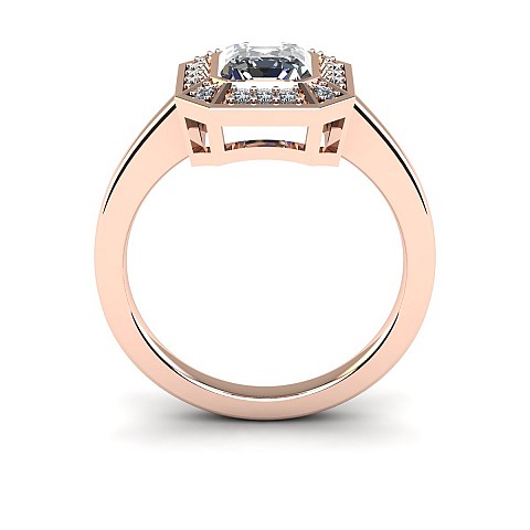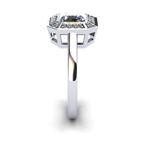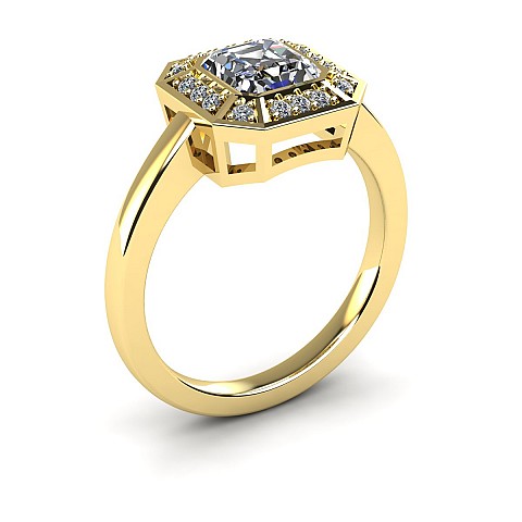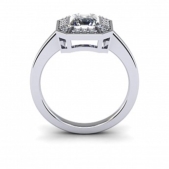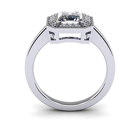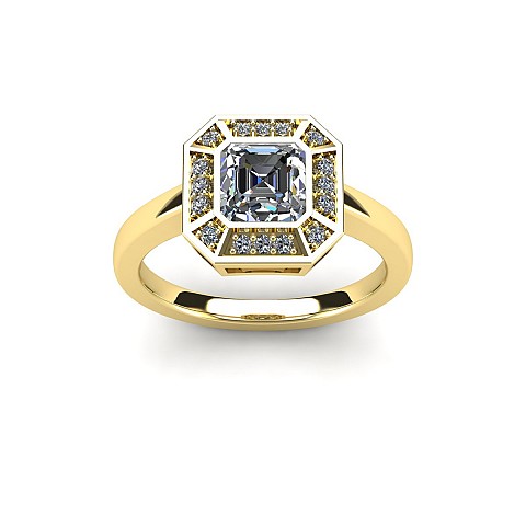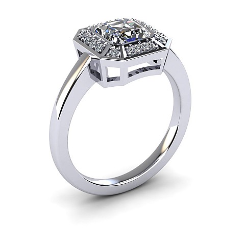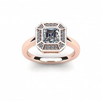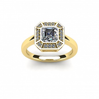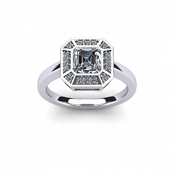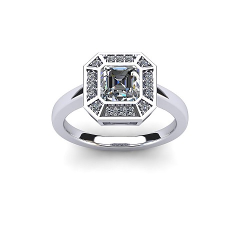 A beautiful setting for a Square Emerald or Asscher cut diamond.The centre diamond is bezel set and surrounded by round brilliants, in an art deco style setting.