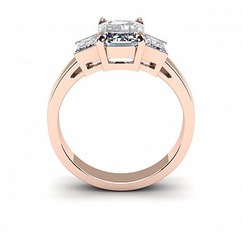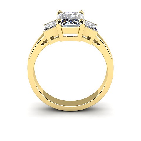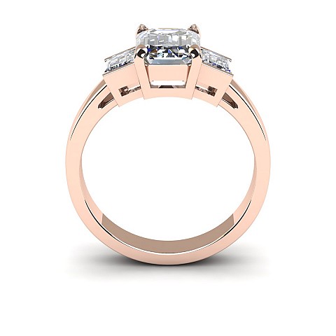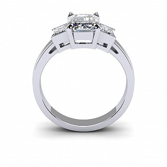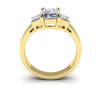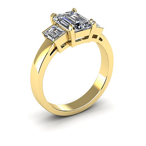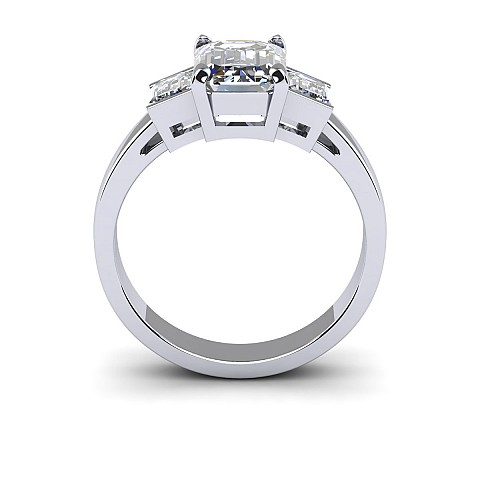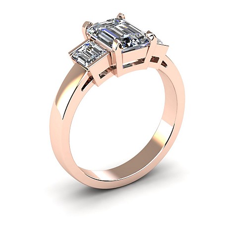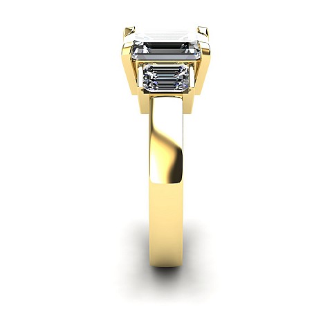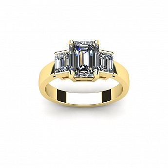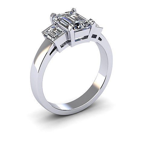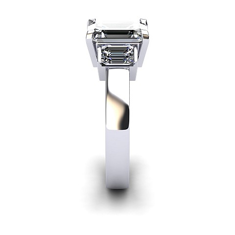 A bold and elegant Emerald cut three stone diamond engagement ring.The centre diamond is secured by four claws while the side diamonds are held in a rub over setting.