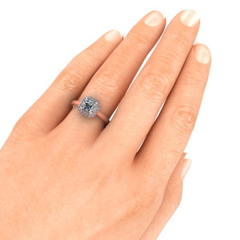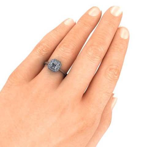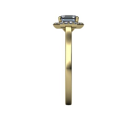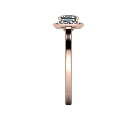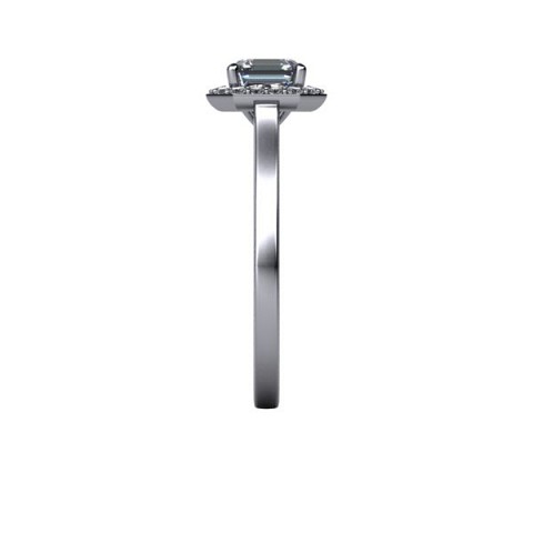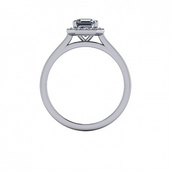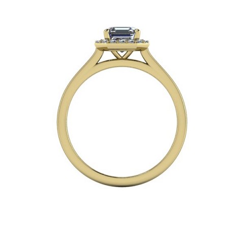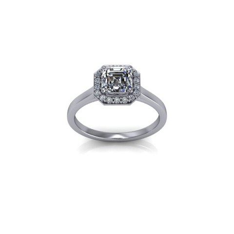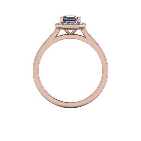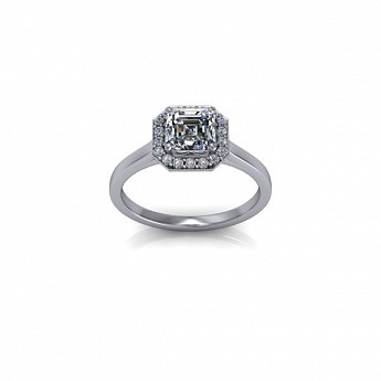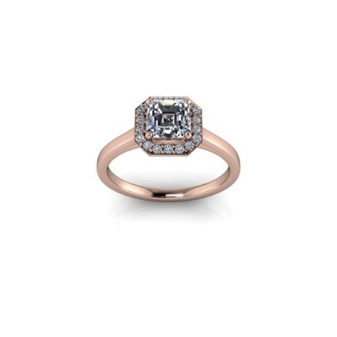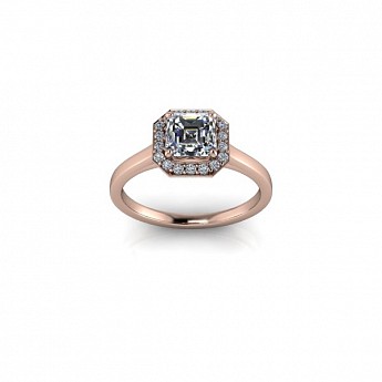 This art-deco inspired engagement ring showcases the asscher cut centre diamond of your choice, surrounded by a delicate halo of round diamonds on a plain band.