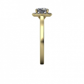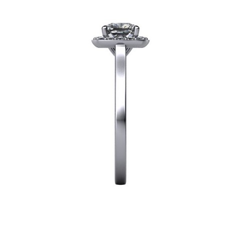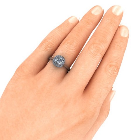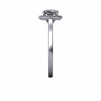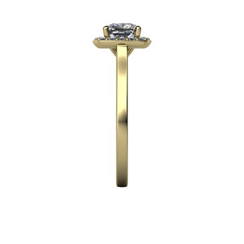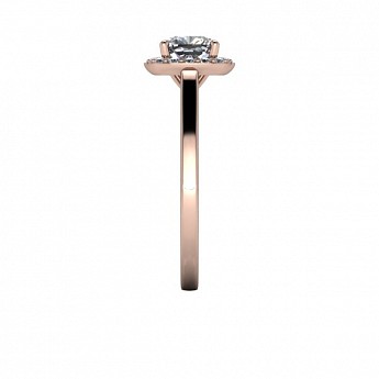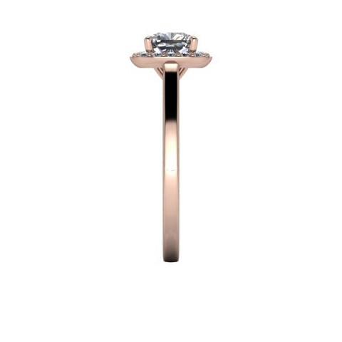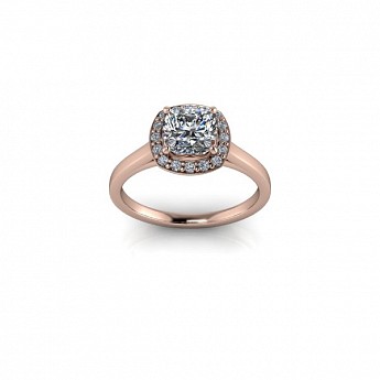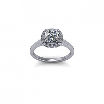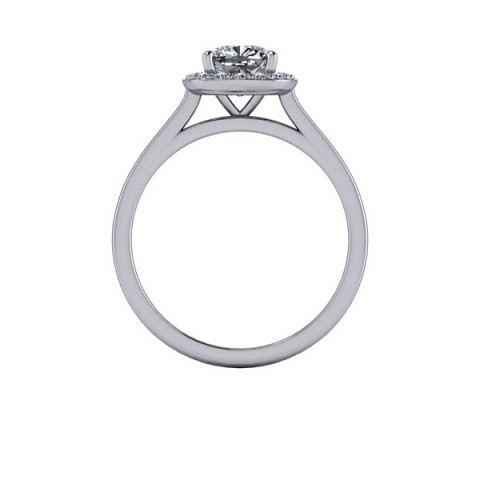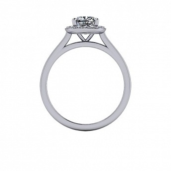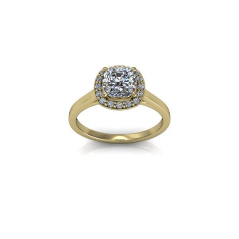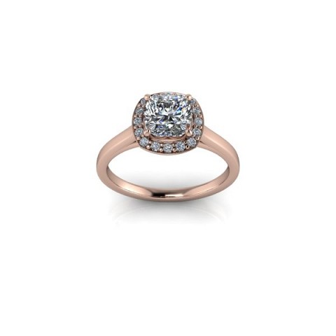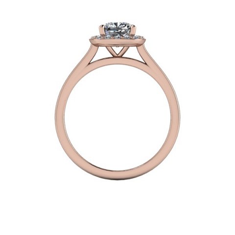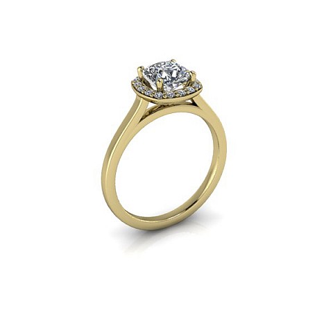 A feminine and modern design showcasing the cushion cut diamond of your choice, surrounded by a delicate halo of round diamonds on a plain band.