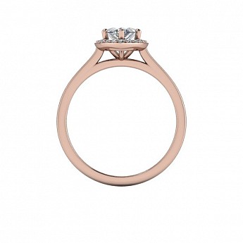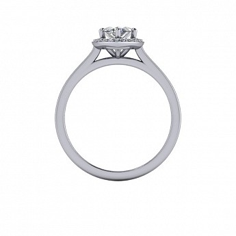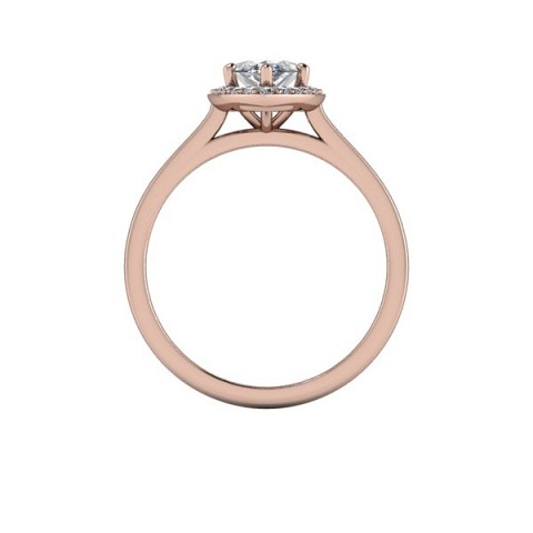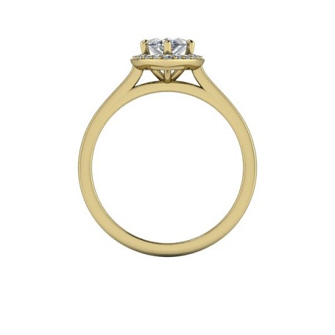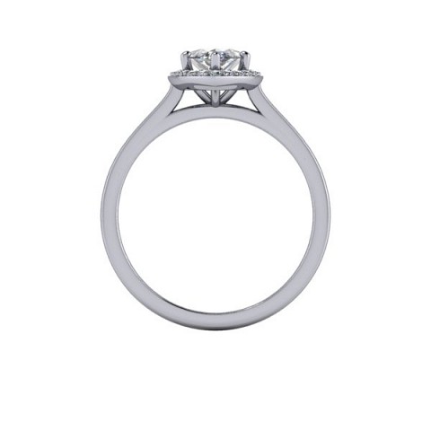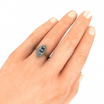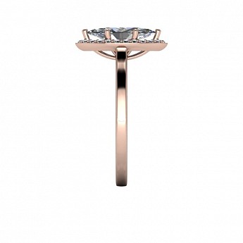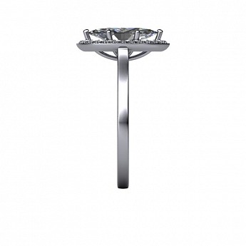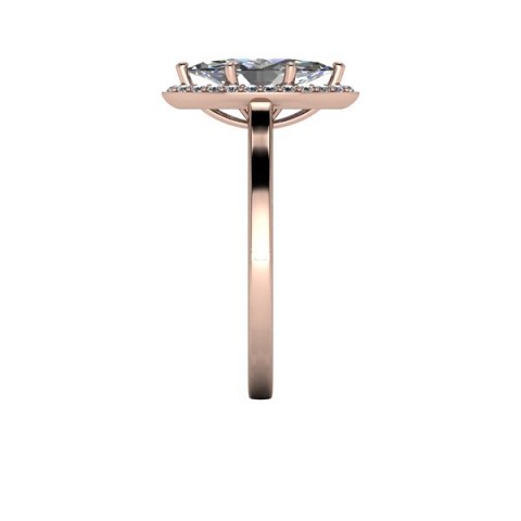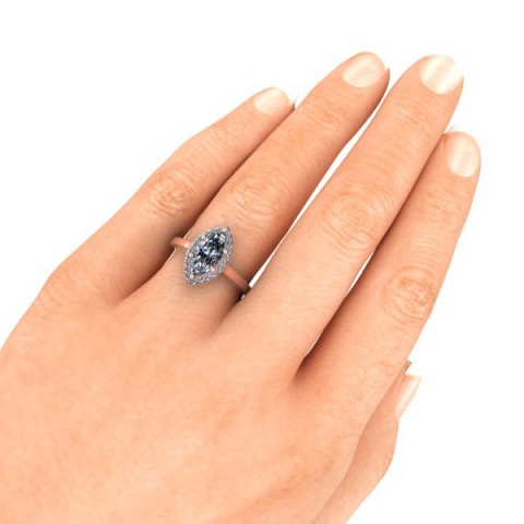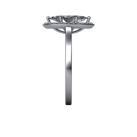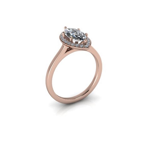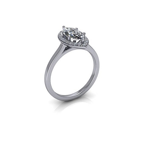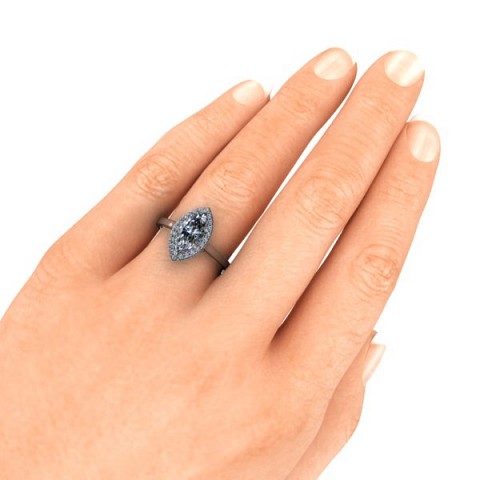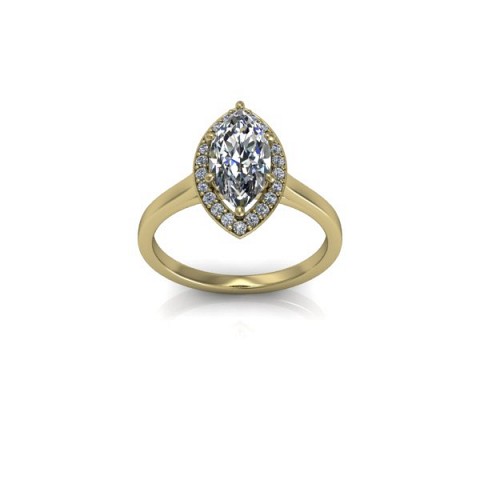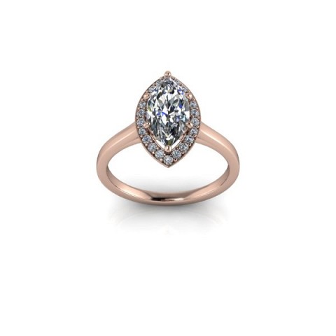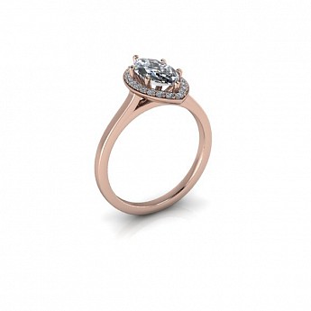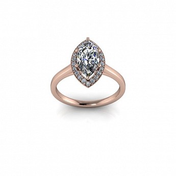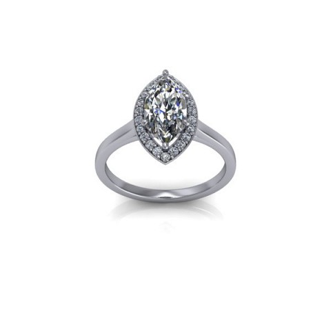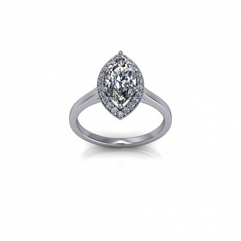 A unique and contemporary engagement ring, featuring a marquise centre diamond surrounded by a delicate halo of round diamonds on a plain band.