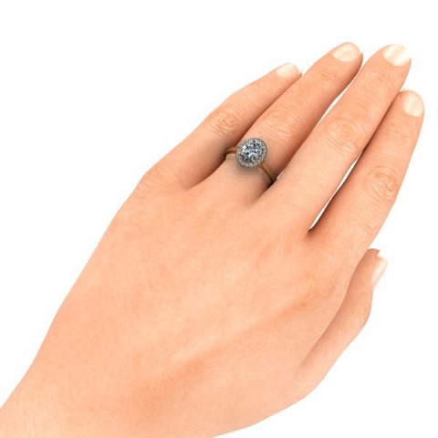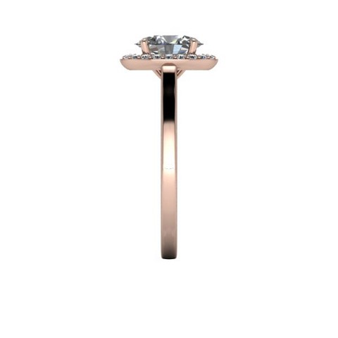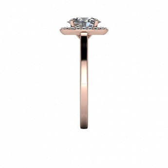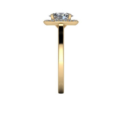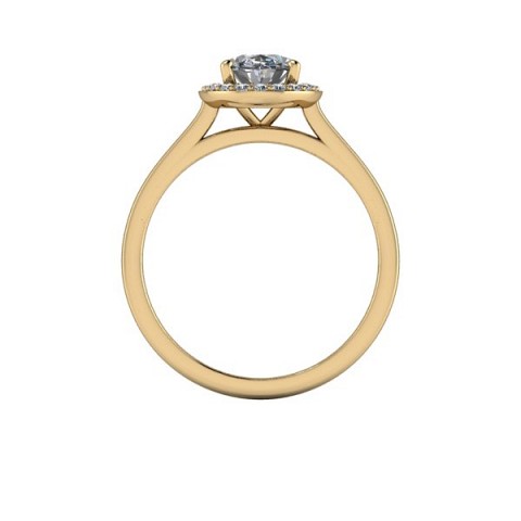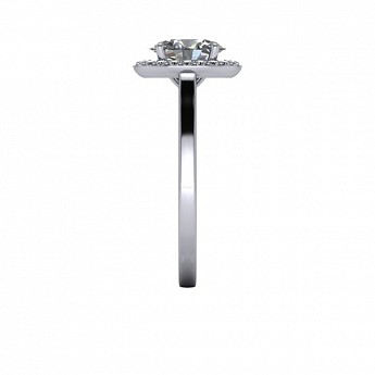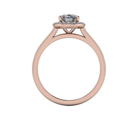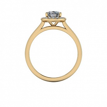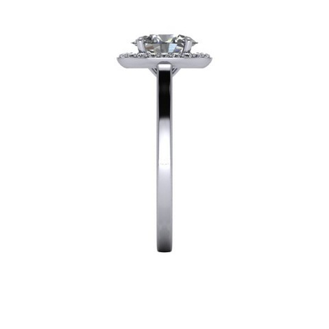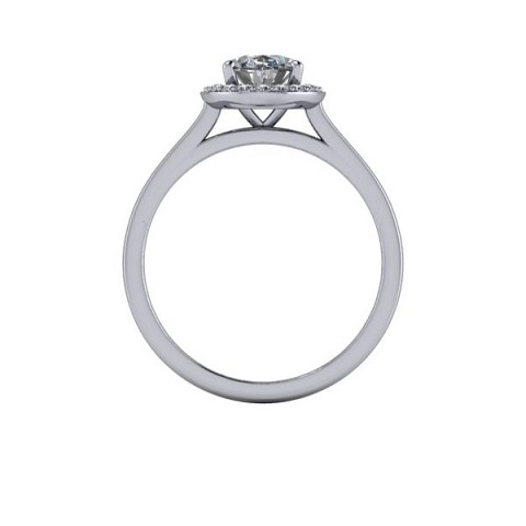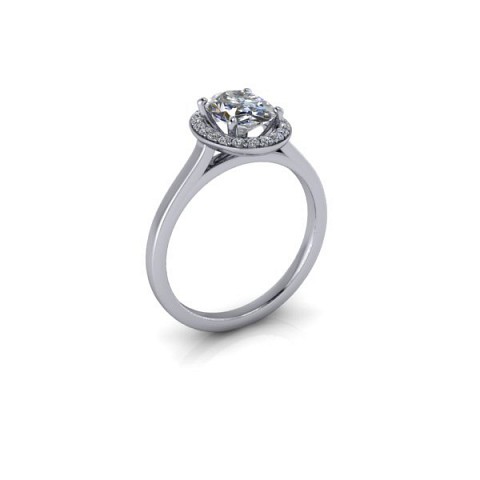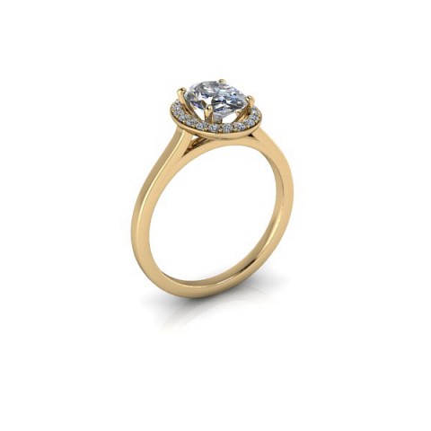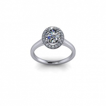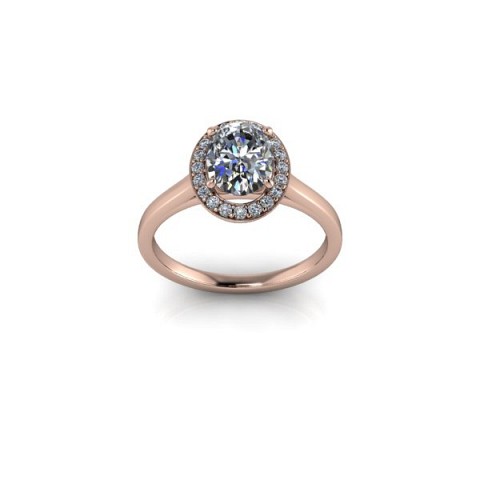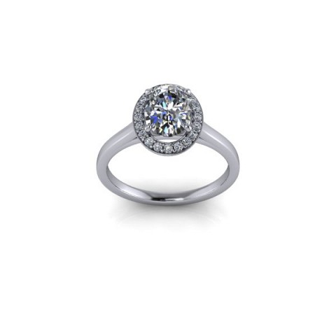 A beautiful and modern engagement ring, featuring an oval centre diamond surrounded by a delicate halo of round diamonds on a plain band.