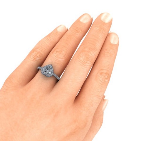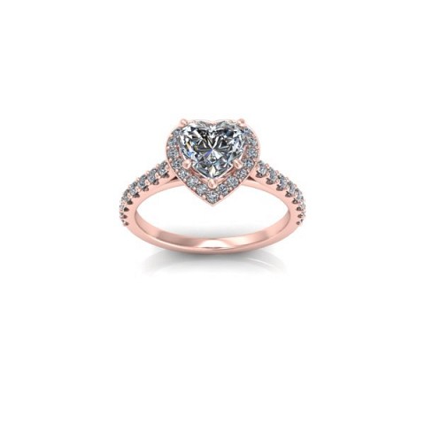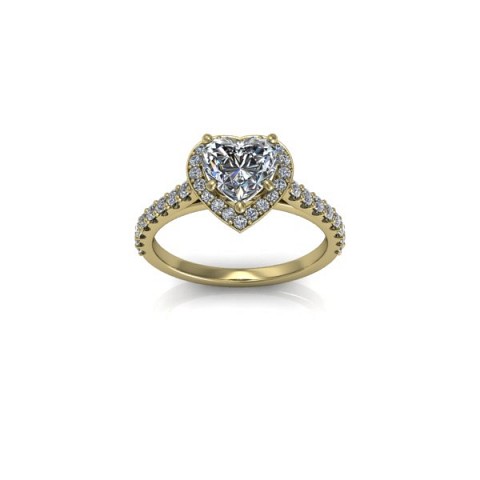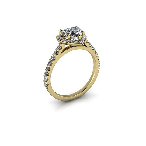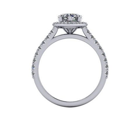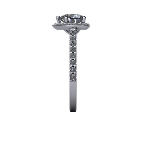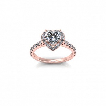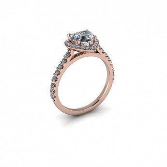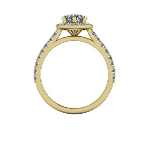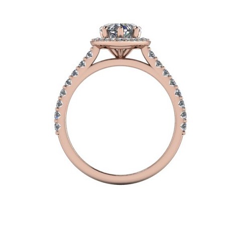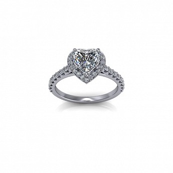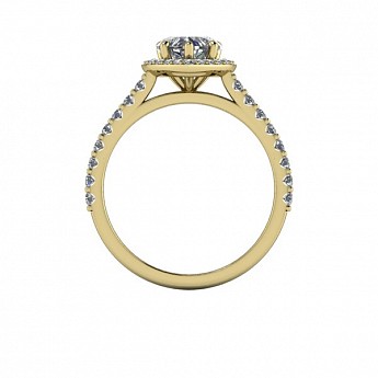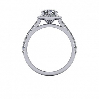 Romantic and beautiful, this design is sure to make her heart sing. The centre diamond is surrounded by a delicate halo of diamonds that also extends down the band for a dazzling effect.