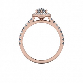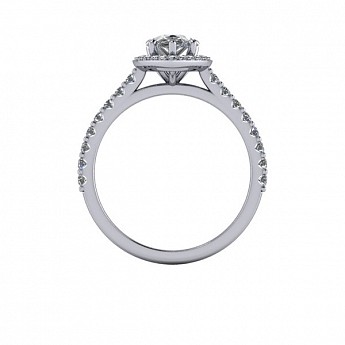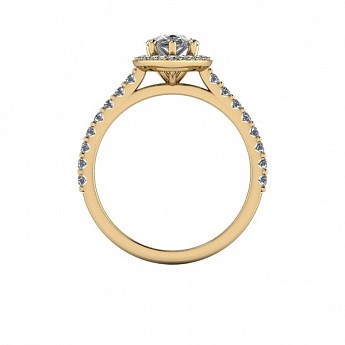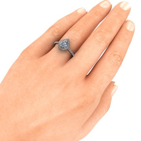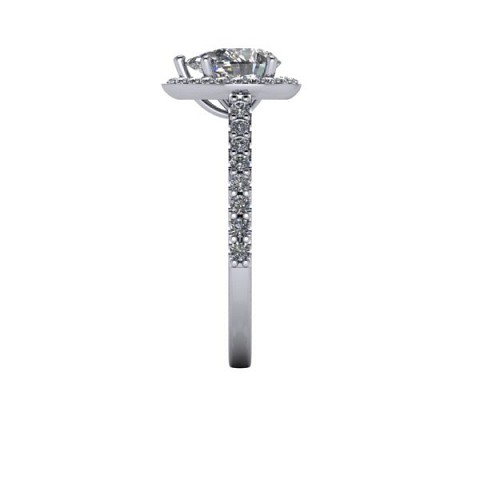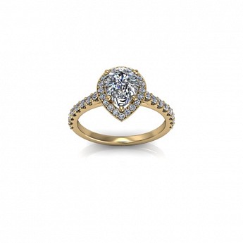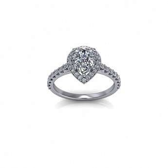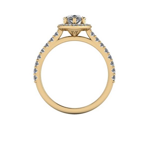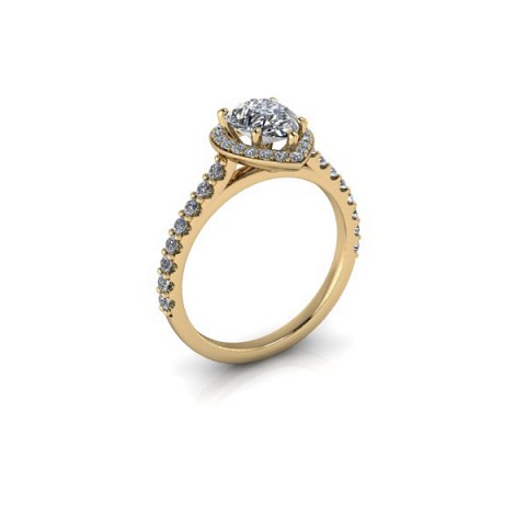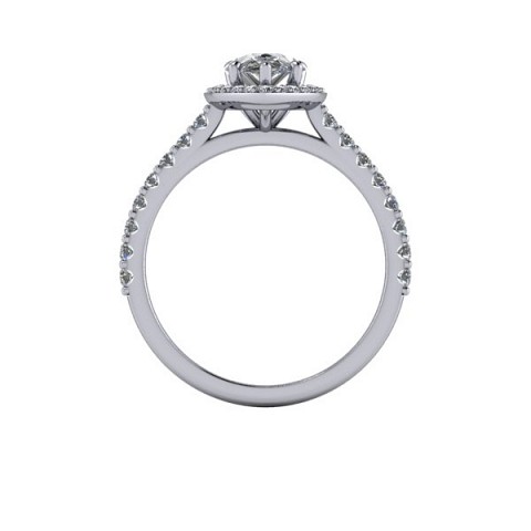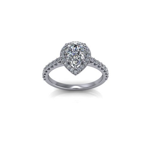 Showcase the pear shape diamond of your choice in this stunning engagement ring design. The centre stone is surrounded by a delicate halo of round diamonds that extends down the band for that extra sparkle and impact.