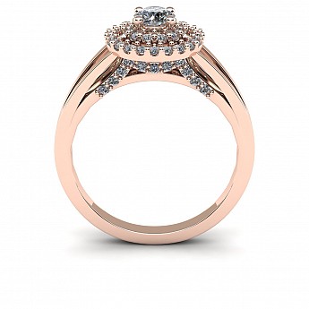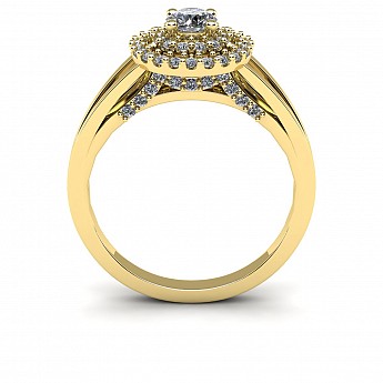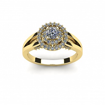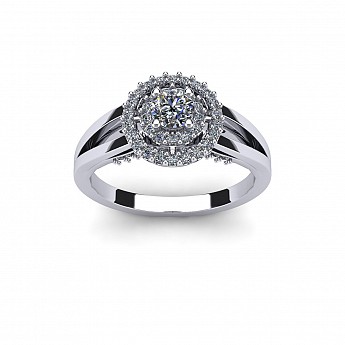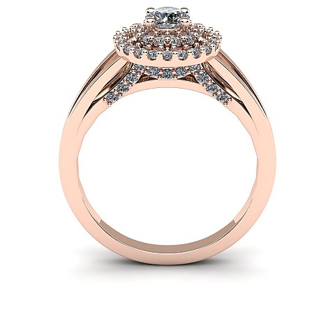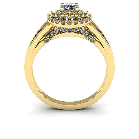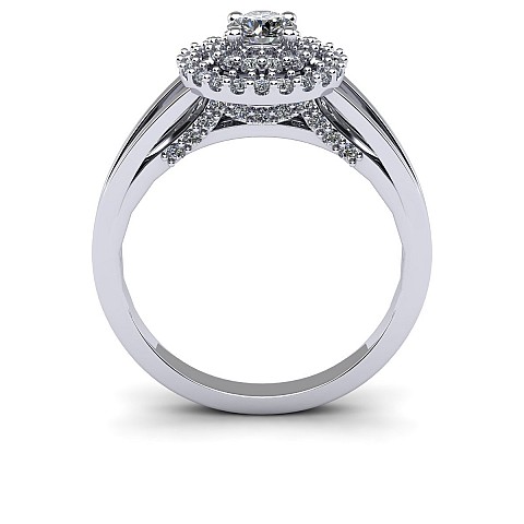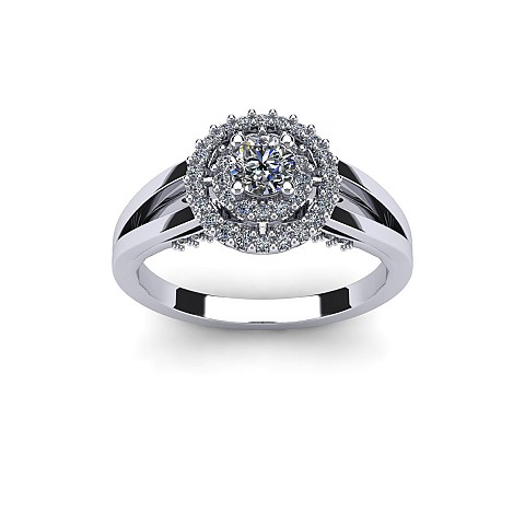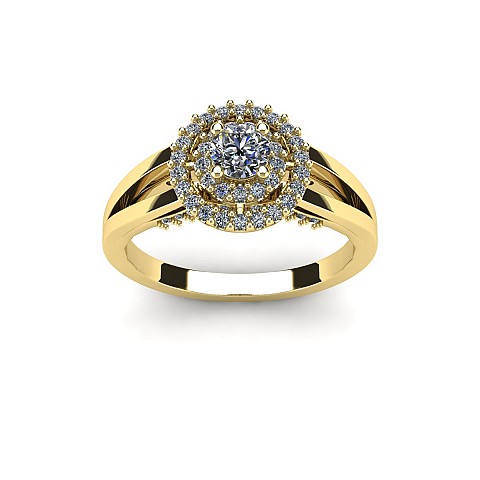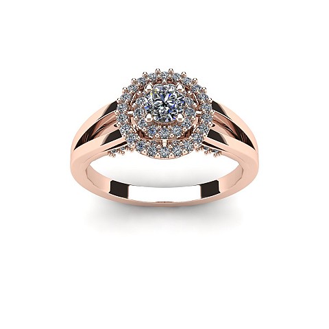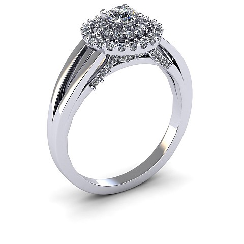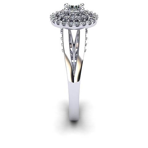 The single round diamond is decorated with a double halo of round brilliants for extra sparkle and size. The split shank shoulders balance the centre perfectly and adds comfort when worn on the hand.