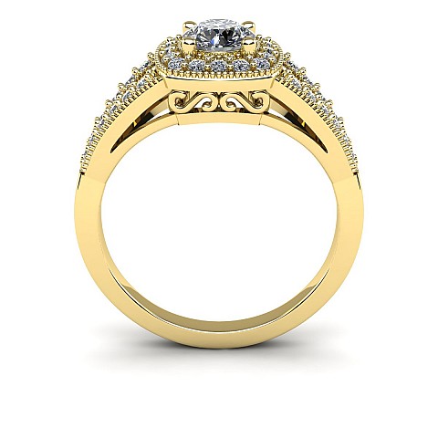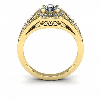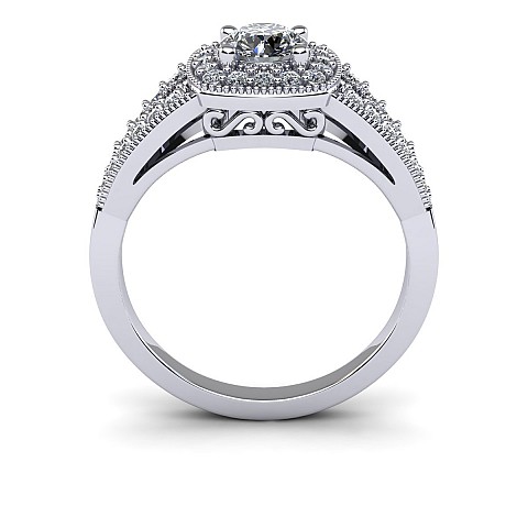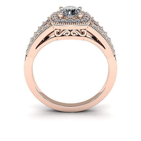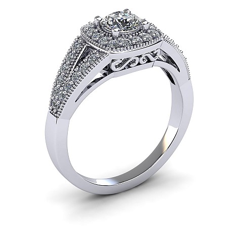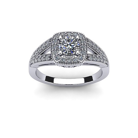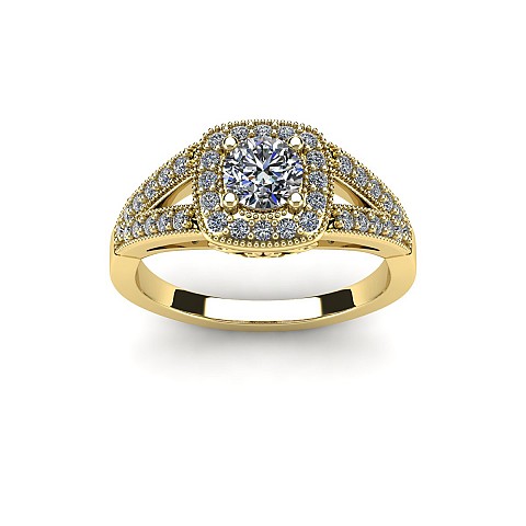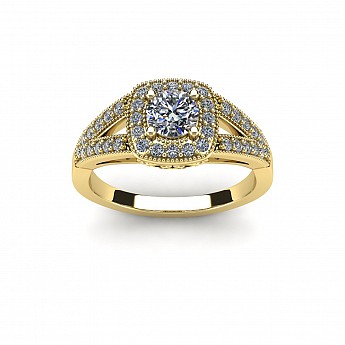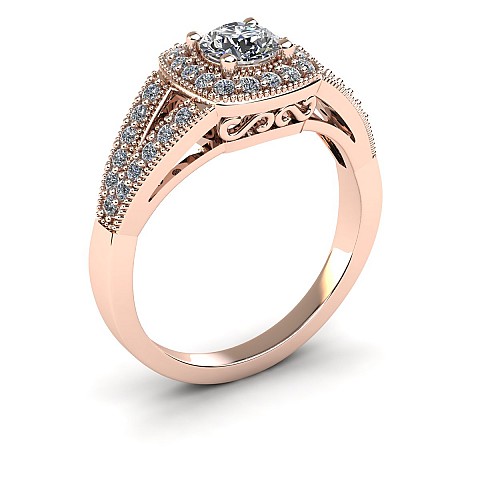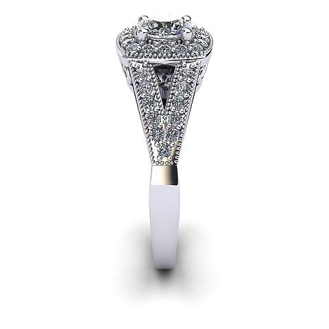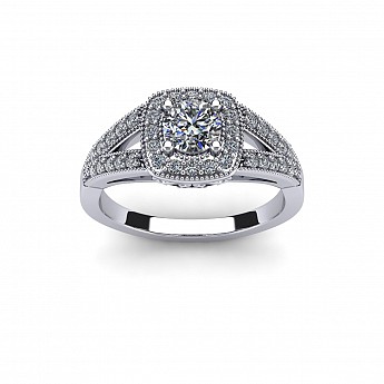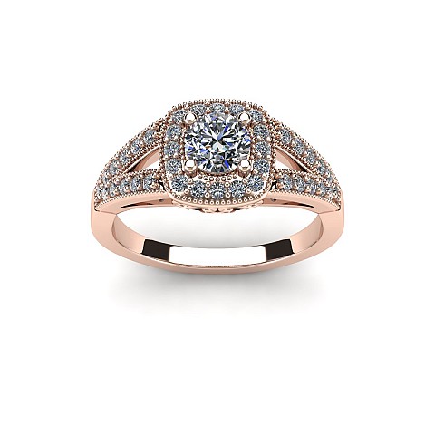 This stunning ring is decorated with bead set round brilliant diamonds and miligrain detailing. The split shank balances the ring on the hand.