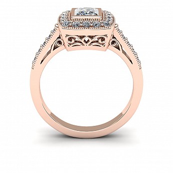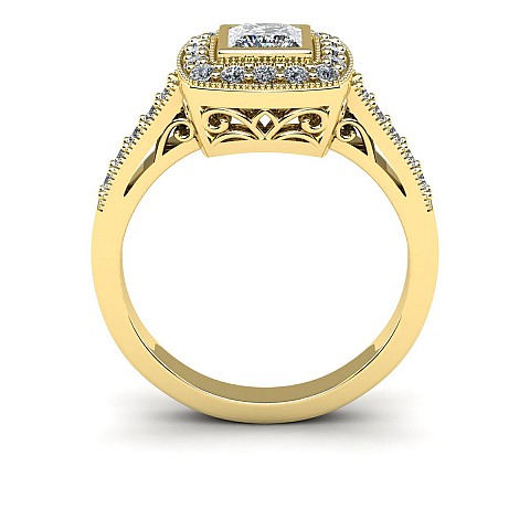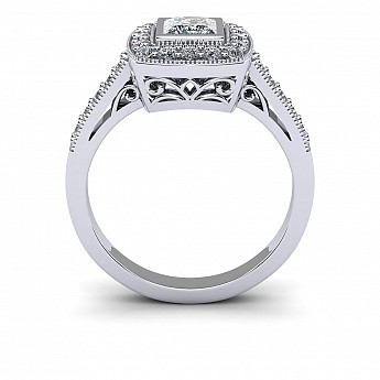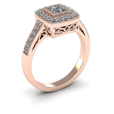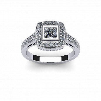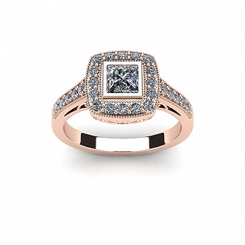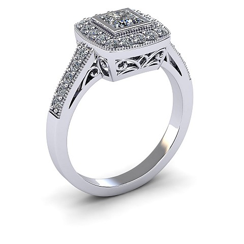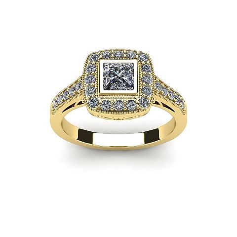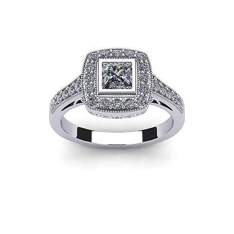 The princess- cut centre stone dazzles in this bezel setting and is decorated with small round brilliant diamonds for added sparkle.