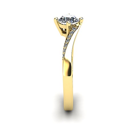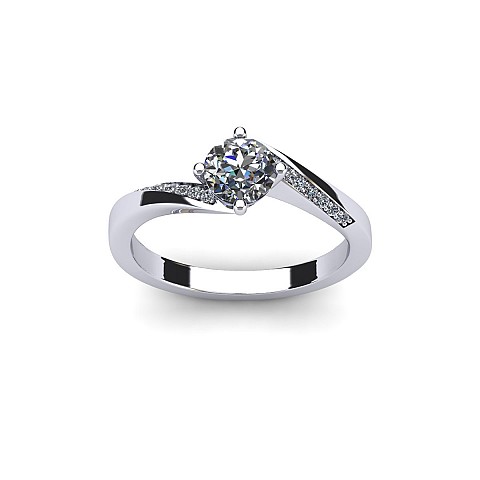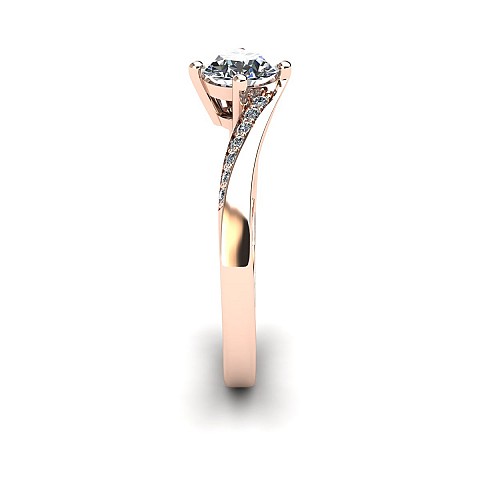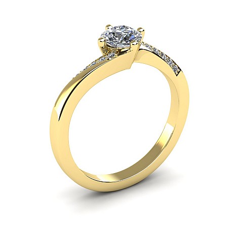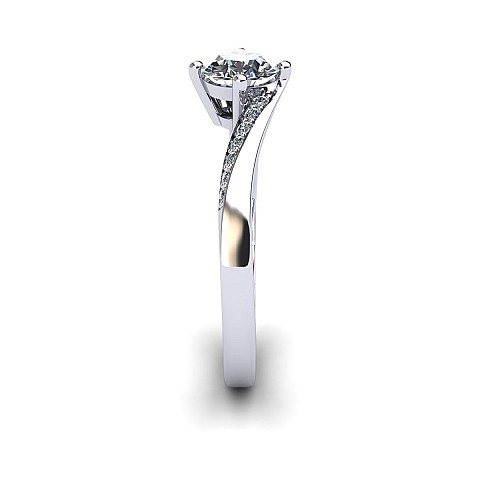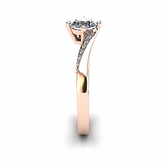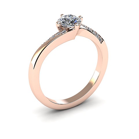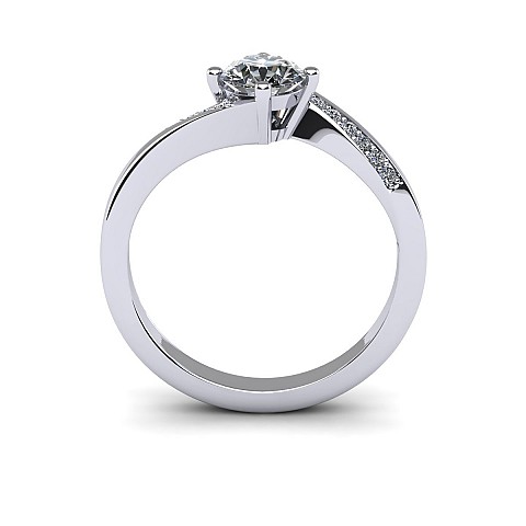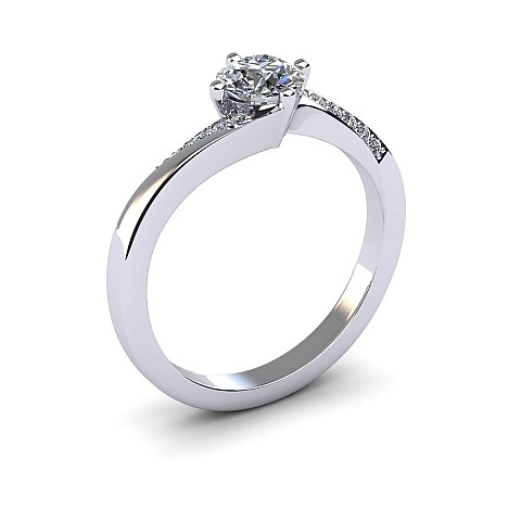 This engagement ring captivates with slightly twisted shoulders towards the back and front claws, decorated with small round brilliant diamonds.
