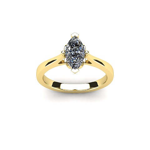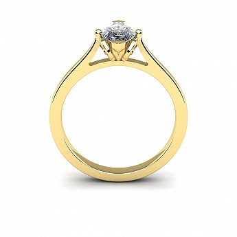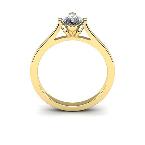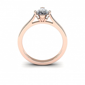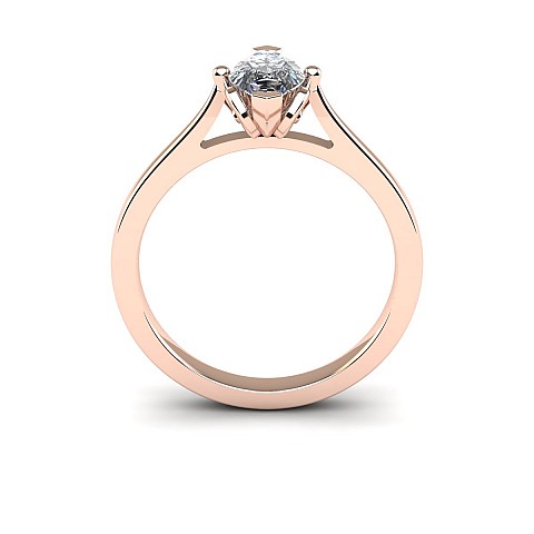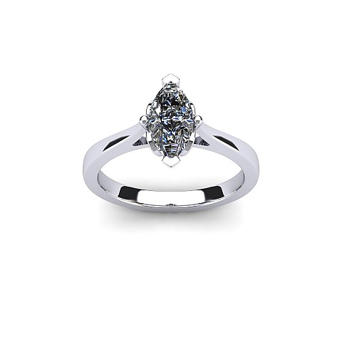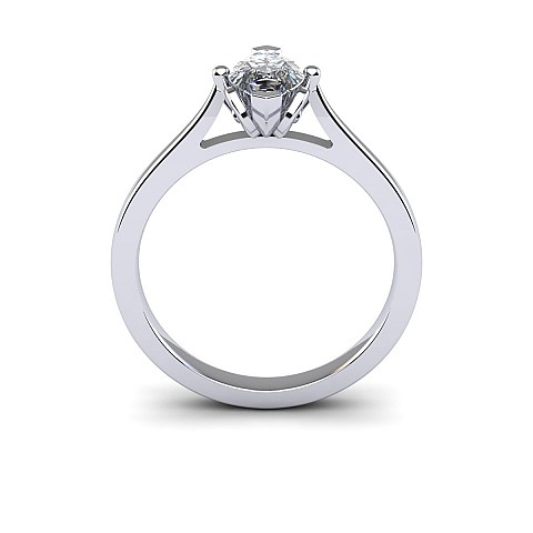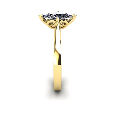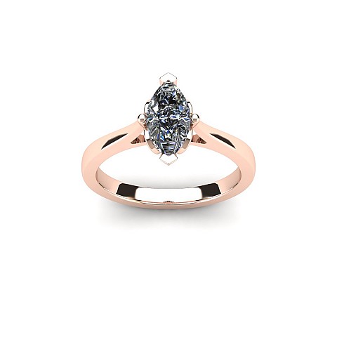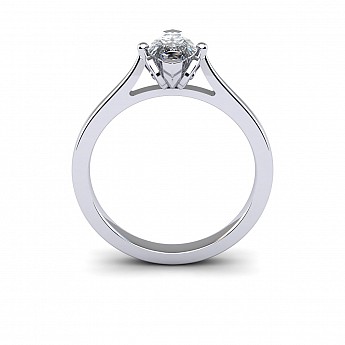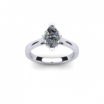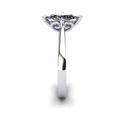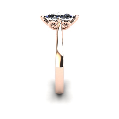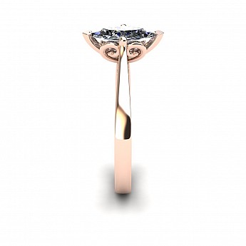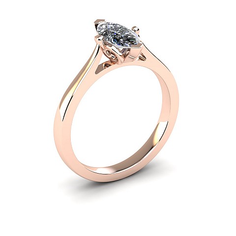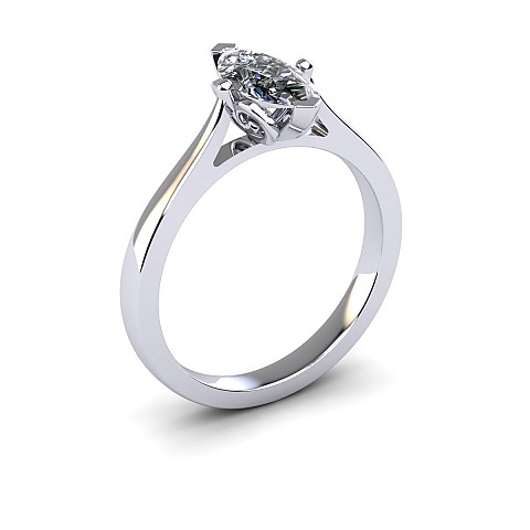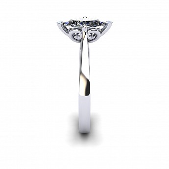 A delicate Marquise engagement ring with an intricate 'swirl' detail that meets the band on either side. The V claws protect the points of the marquise and the diamond sits on a cathedral style band that tapers towards the center stone.