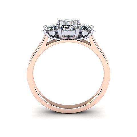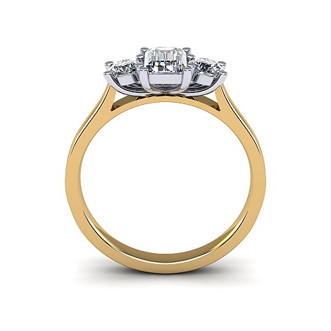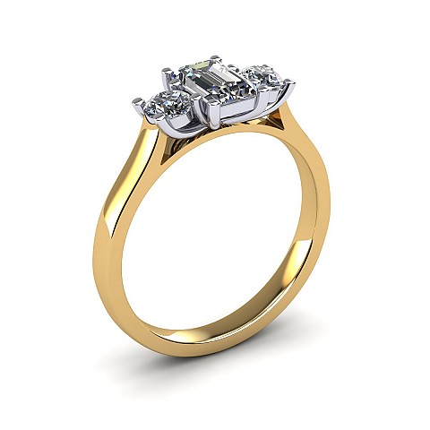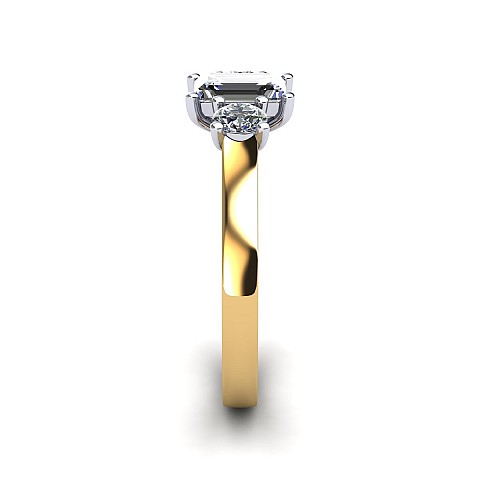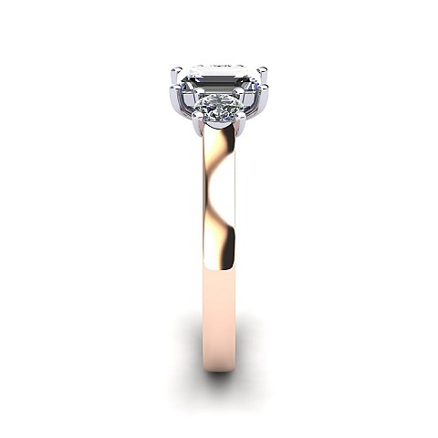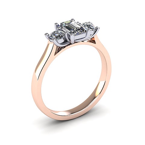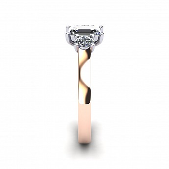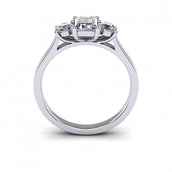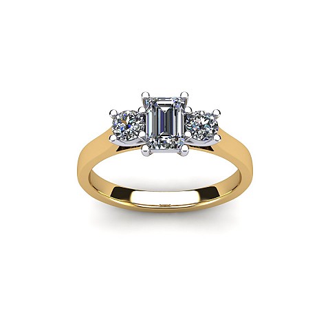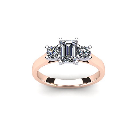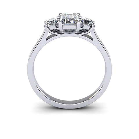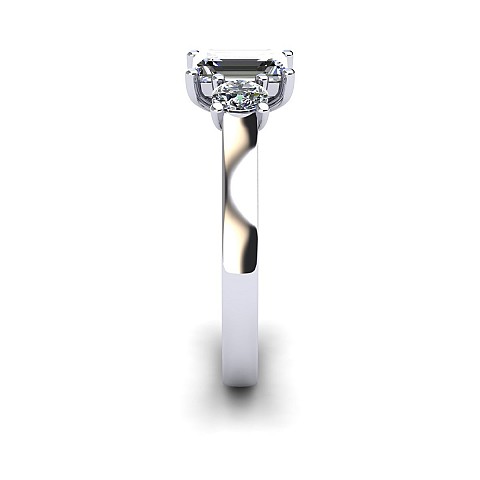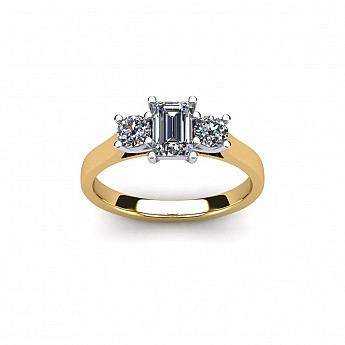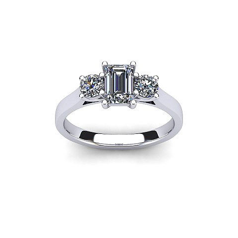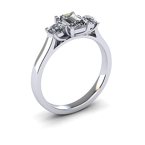A wonderful emerald cut engagement ring with a vintage feel, accented by two round side diamonds.
