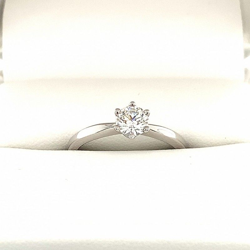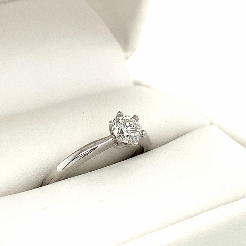 This ring feautures a stunning 0.503 carat round diamond in a beautiful 18k white gold setting. The diamond is held securely in six claws, while the half-round band is delicately pinched in at the shoulders.
