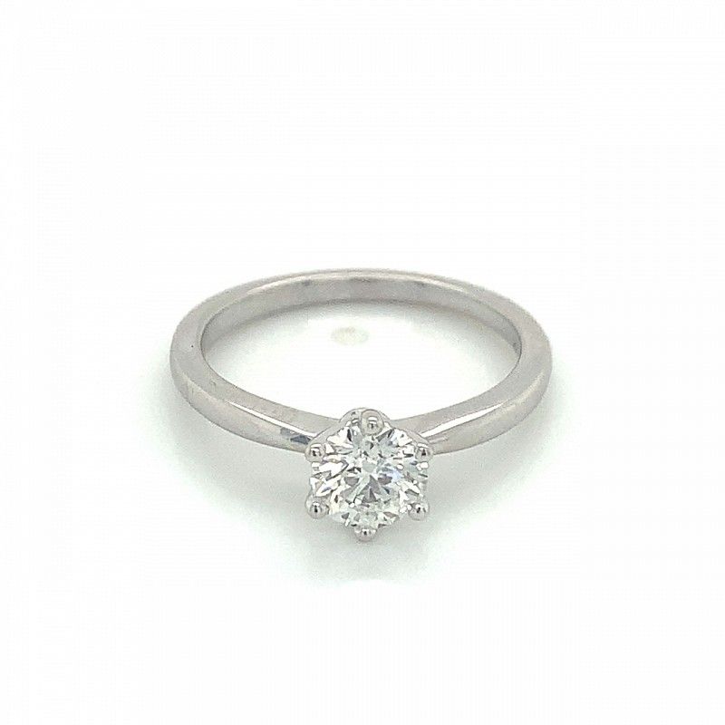 This timeless 18k white gold & diamond solitaire ring has an elegant design. The centre diamond is held securely with six claws & has a deeply scalloped setting to showcase the beautiful centre diamond. The half-rounded band features pinched-in shoulders.