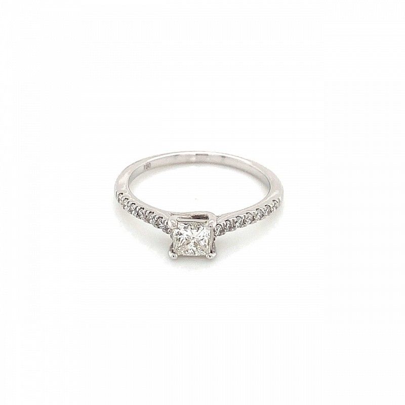 This ring feautures a stunning 0.40ct princess cut diamond in a four claw setting. This is beautifully accented by 14 round brilliant diamonds on the shoulders. Total diamond weight is 0.56ct.