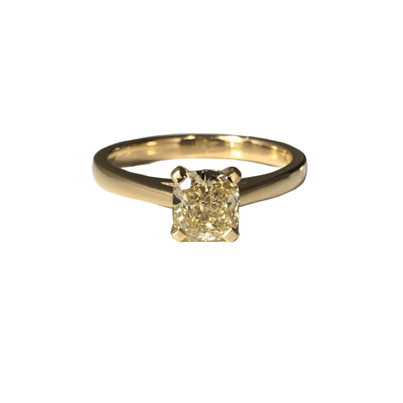 This stunning ring features a 1.00 carat natural fancy yellow cushion cut diamond. It is set beautifully in our classic four claw solitaire 'Mia' setting, in 18k Yellow Gold.