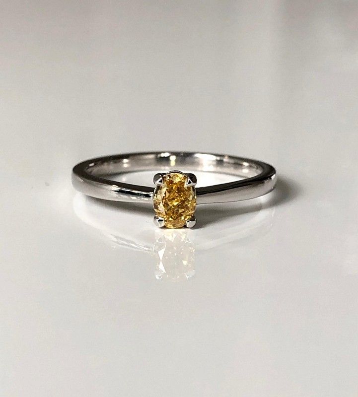 Featuring a beautiful 0.38ct Fancy Intense Orange-Yellow Oval diamond held in our 'Madison' solitaire setting, in 18k white gold. This is perfect if you are looking for a unique engagement or dress ring.